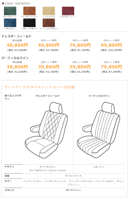 改めて発送日のご連絡をさせていただきます ※お時間お急ぎなお客様は、御購入お手続き前に納期のお問合せをなさって下さい■ Bellezza ヴィンテージスタイルシートカバー ■ ※色味はモニター環境等で異なります ■ 装着参考画像 ■ ≪ スズキ ハスラー バーティカルライン オリーブグリーン ≫ ※ステッチ縫製デザインは車種毎に異なります※色味はモニター環境等で異なります ≪ ダイハツ ムーヴキャンバス チェスターフィールド インディゴブルー ≫ ※ステッチ縫製デザインは車種毎に異なります ※色味はモニター環境等で異なります ≪ スズキ ジムニー バーティカルライン トパーズイエロー ≫ ※ステッチ縫製デザインは車種毎に異なります※色味はモニター環境等で異なります ≪ トヨタ アルファード チェスターフィールド バーガンディーレッド ≫ ※ステッチ縫製デザインは車種毎に異なります ※色味はモニター環境等で異なります ≪ ホンダ ヴェゼルハイブリッド バーティカルライン ヴィンテージキャメル ≫ ※ステッチ縫製デザインは車種毎に異なります ※色味はモニター環境等で異なります ● 適合に表記がない限り、純正で本革シートもしくは合皮シートのお車、福祉車両には取付は出来ません。